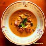 The base of the dish is the Thai Curry paste traditionally made with mortar and pestle. Traditional ingredients used in the Red Curry paste are red bird’s eye chillies, shallots, garlic, shrimp paste, galangal, kafir lime leaves, coriander seeds, coriander roots, cumin and lemon grass. It becomes a little difficult to procure a few of these ingredients and hence I’ve perfected a recipe based on ingredients available in India.